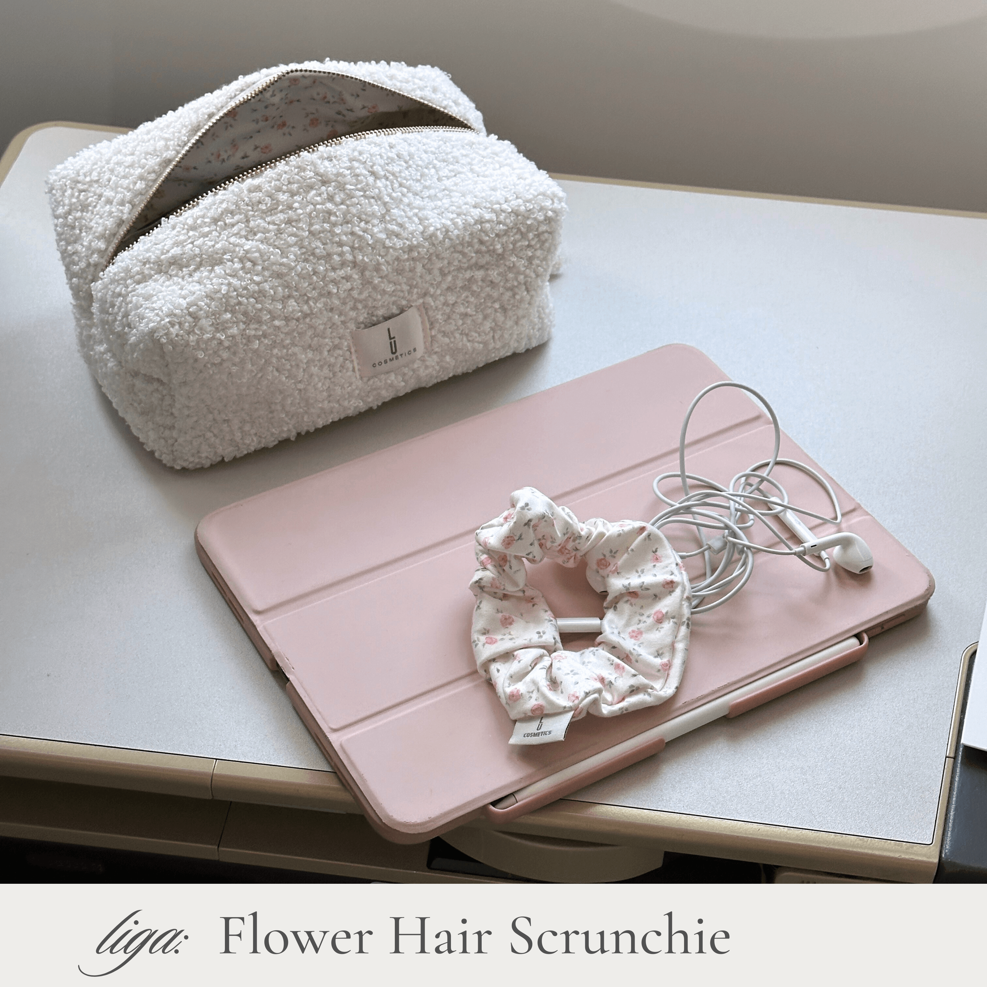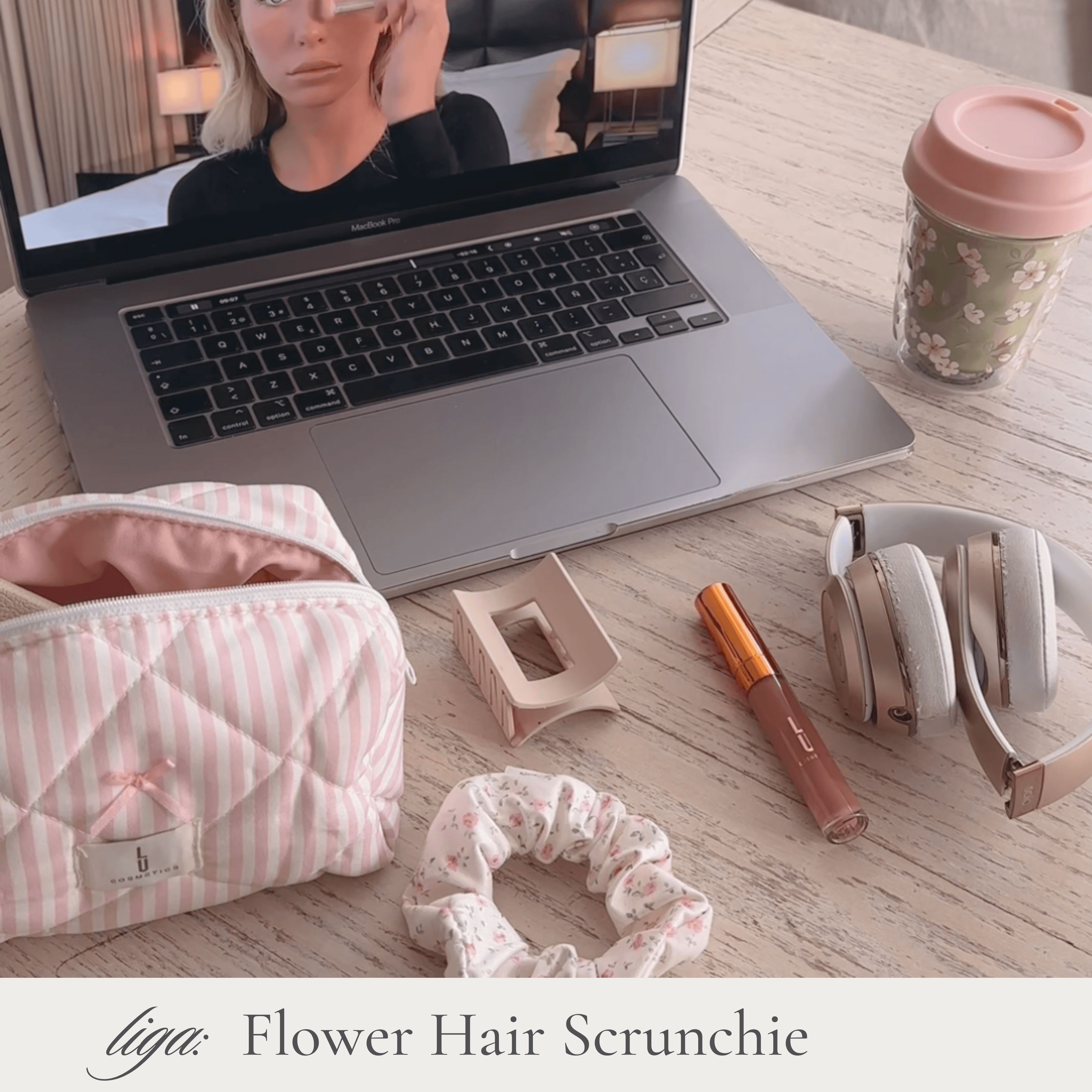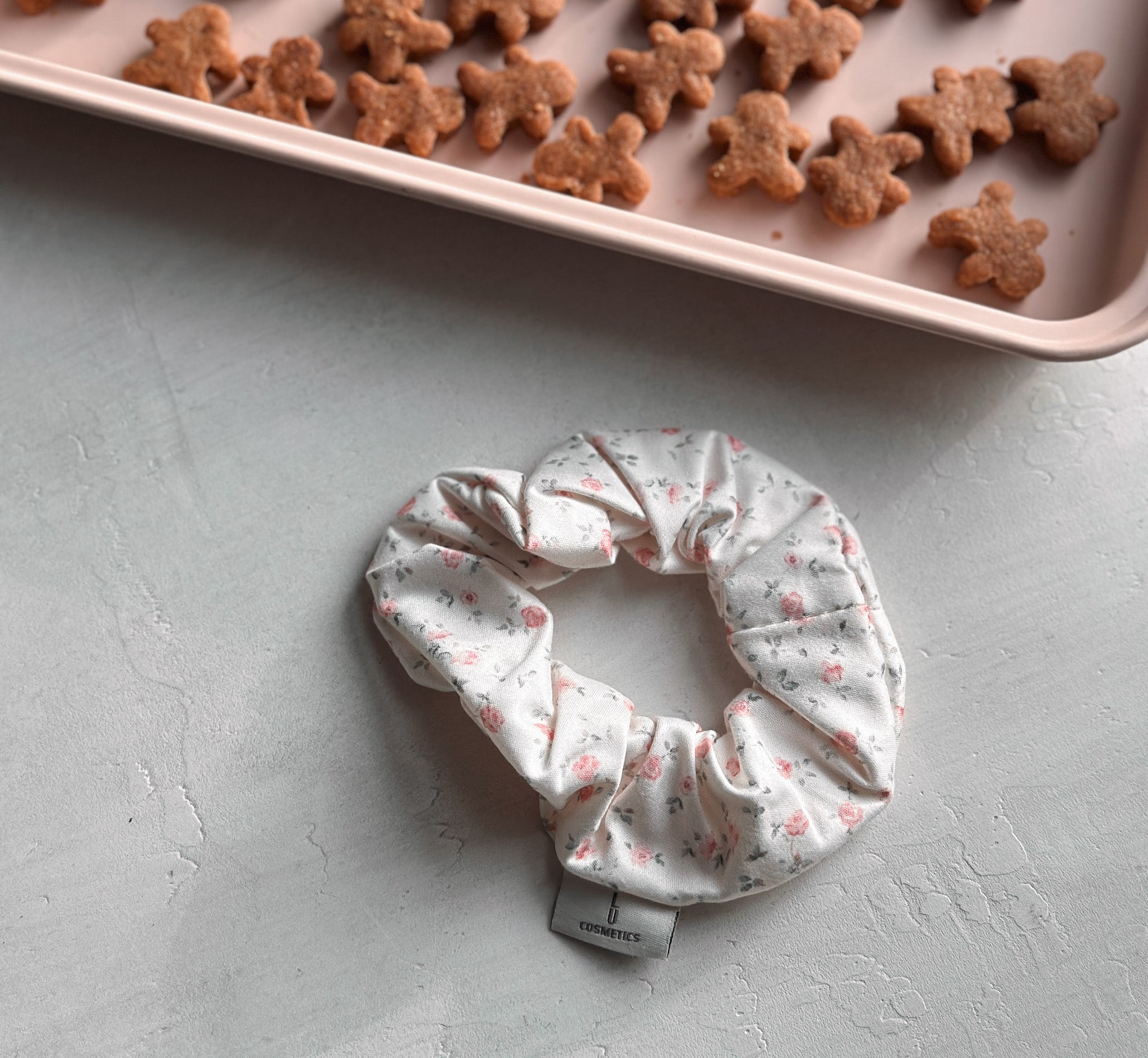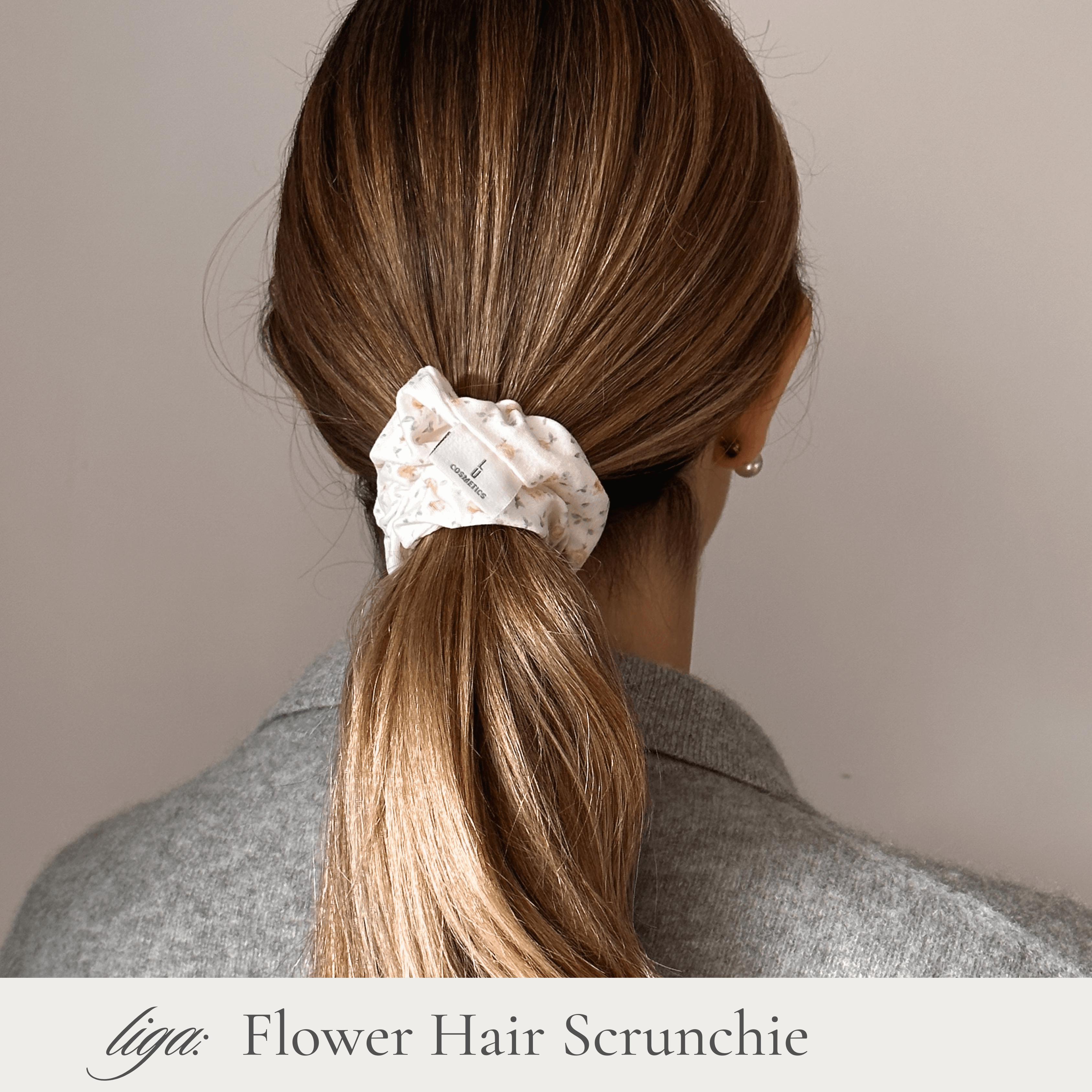 Scrunchie floral de algodón orgánico. Suave, cómoda y hecha a mano. Diseño elástico medio-duro que se adapta a cualquier tipo de pelo.